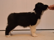 A very attractive bitch with a beautiful head and expression. Well angulated shoulder, balanced rear angulation and lovely parallel hocks. Very free and easy movement. Showed with great maturity especially as this was her first show.A video of her moving in the ring can be seen here.