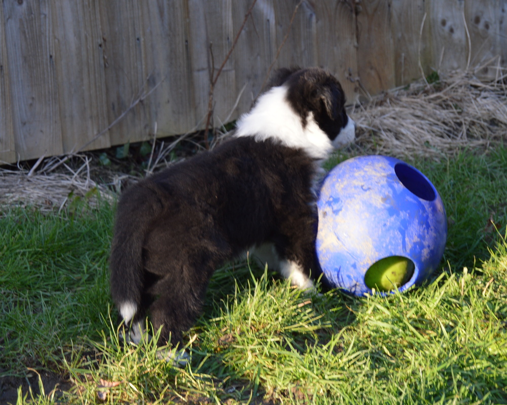 Buffy has given birth to 5 puppies by Sh Ch Caleykiz Mystical Dragon JW (Slider), 4 boys and 1 girl. Buffy's main job, after she did a bit of breed showing (she got her american championship at 9 months and 2 days and won very well in the classes in the UK), is helping out on the farm — while she'd naturally prefer the easier sheep, she'll move even the most difficult lot when told to (a video of her working at 20 months can be seen here). Buffy often works together with her mum, Eowyn, at which point Buffy pushes on the flock while Eo covers the hillside. Buffy is also agility trained and has done bits and pieces of obedience, so she can demo her skills to anyone interested — she's very toy motivated and keen to please.