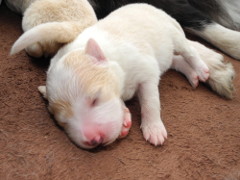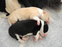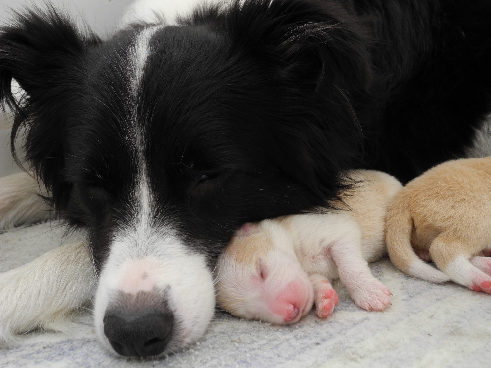 Our six puppies were born between 2:17am and 15:52. Photos below in order of appearance. My greatest thanks go to Bruce & Sheena whose night's sleep was disturbed with a very panicked text asking for advice (and again another 12 hours later...), to Bri who kept me company, long-distance, all the way through the birth of the bulk of the pups (we thought she was done after the four girls!), and Chris whose reassurance and advice made the second batch of pups possible.