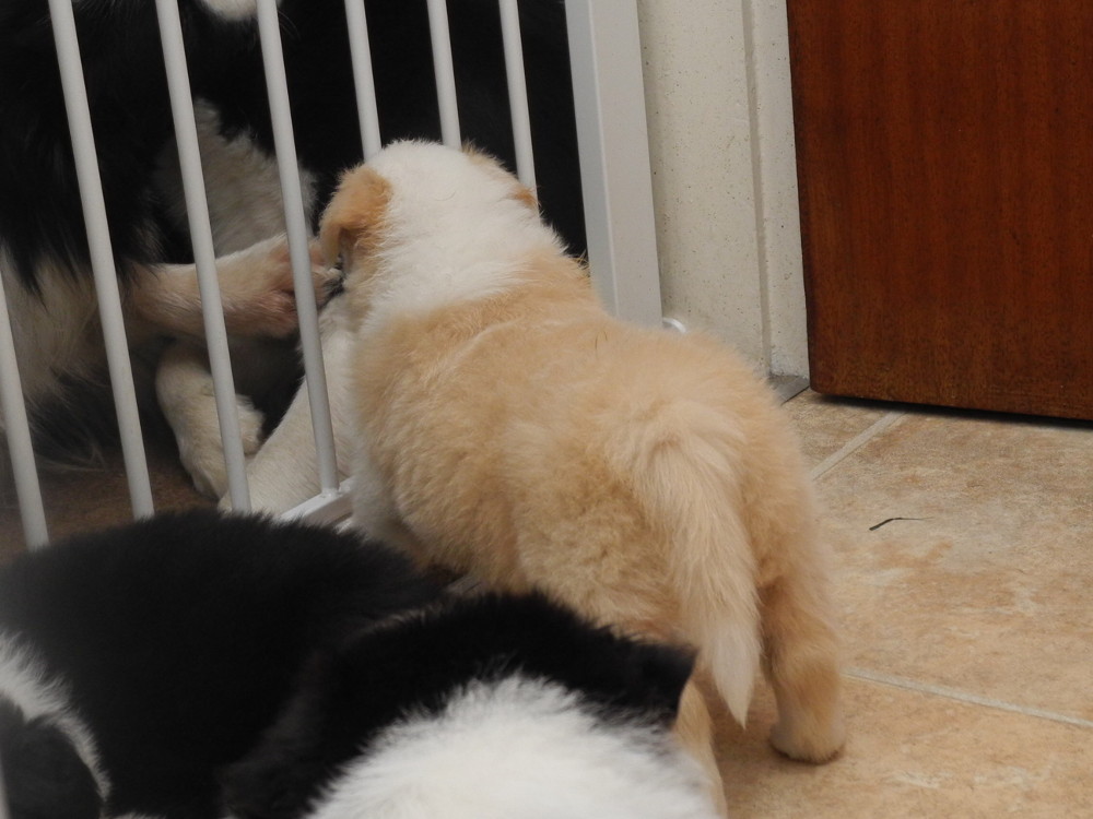 A remodel for the pups which gives them a bigger area to explore. The other dogs now have access to the outside of the puppy pen — they think it's great! A short video of the pups enjoying their 'freedom' — they'd already been zooming for a while, so some were quite tired by this point!