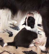 Although Gala was carrying three puppies (all classically marked, black and white girls), we only have one puppy which survived the birth. I will be eternally grateful to Julie, for leaving work to come and help, Chris for support, and to Debbie for fronting the first "help" phone call. The surviving puppy does appear to be very mobile and squeaky (!) so we're hoping that Gala will have at least the one to look after. She's being a very good Mum — she does not like being hot, but she continues to lie on the heating pad as she knows that puppy's happier there!
